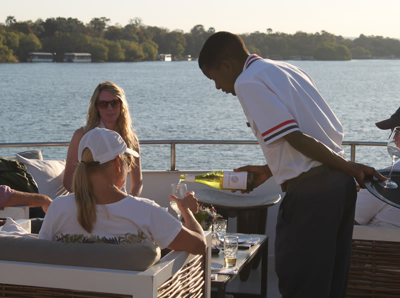 Once The Zambezi Explorer has docked after the sunset cruise at approximately 6.30pm, passengers on the boat may elect to stay on board to enjoy dinner and drinks, and the Signature Lounge will open its doors to walk in guests, subject to availability. The Signature Lounge is an ideal meeting place at the end of the day for tourists and locals alike as it is an affordable yet sophisticated alternative meeting place as the sun sinks into the Zambezi River.